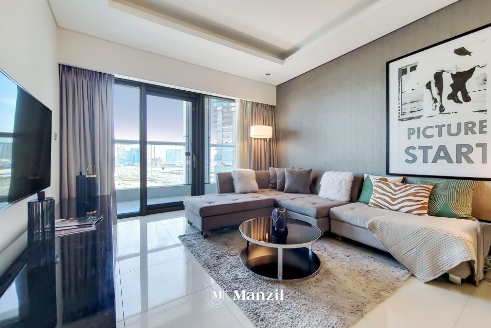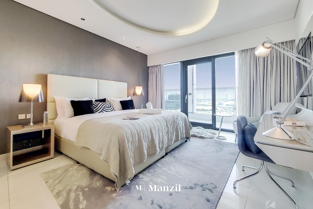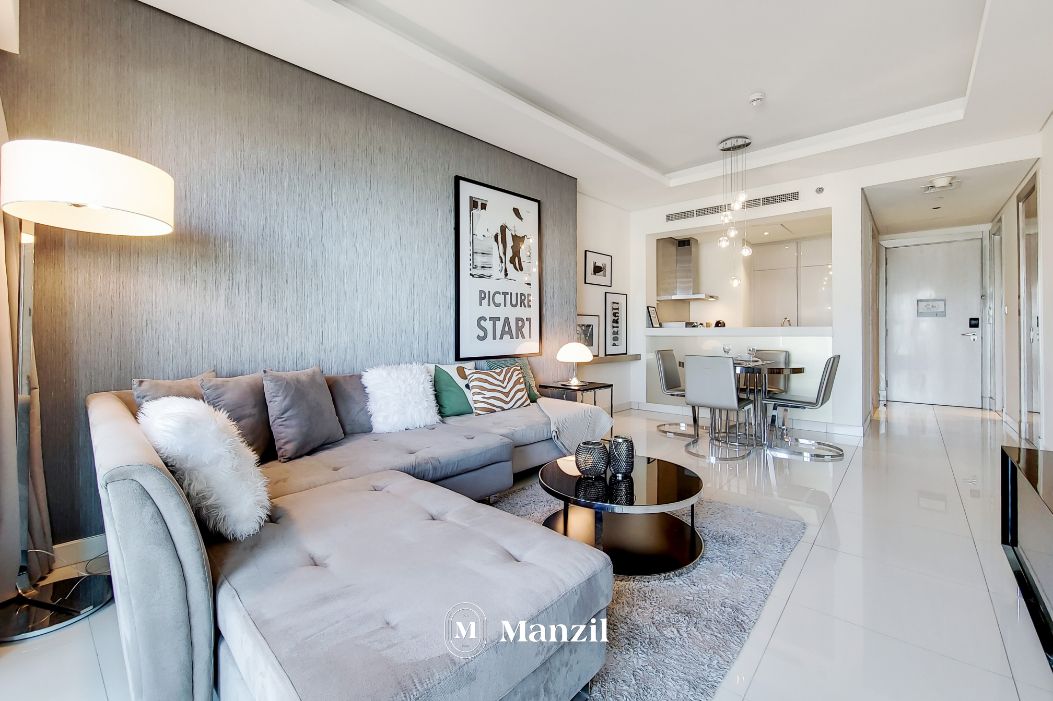 This suave 1 BR with a spacious living room in Business Bay is modern, luxe and cozy! The grey tones are lovely, and it’s the perfect camp for those who want to stay close to Downtown Dubai.