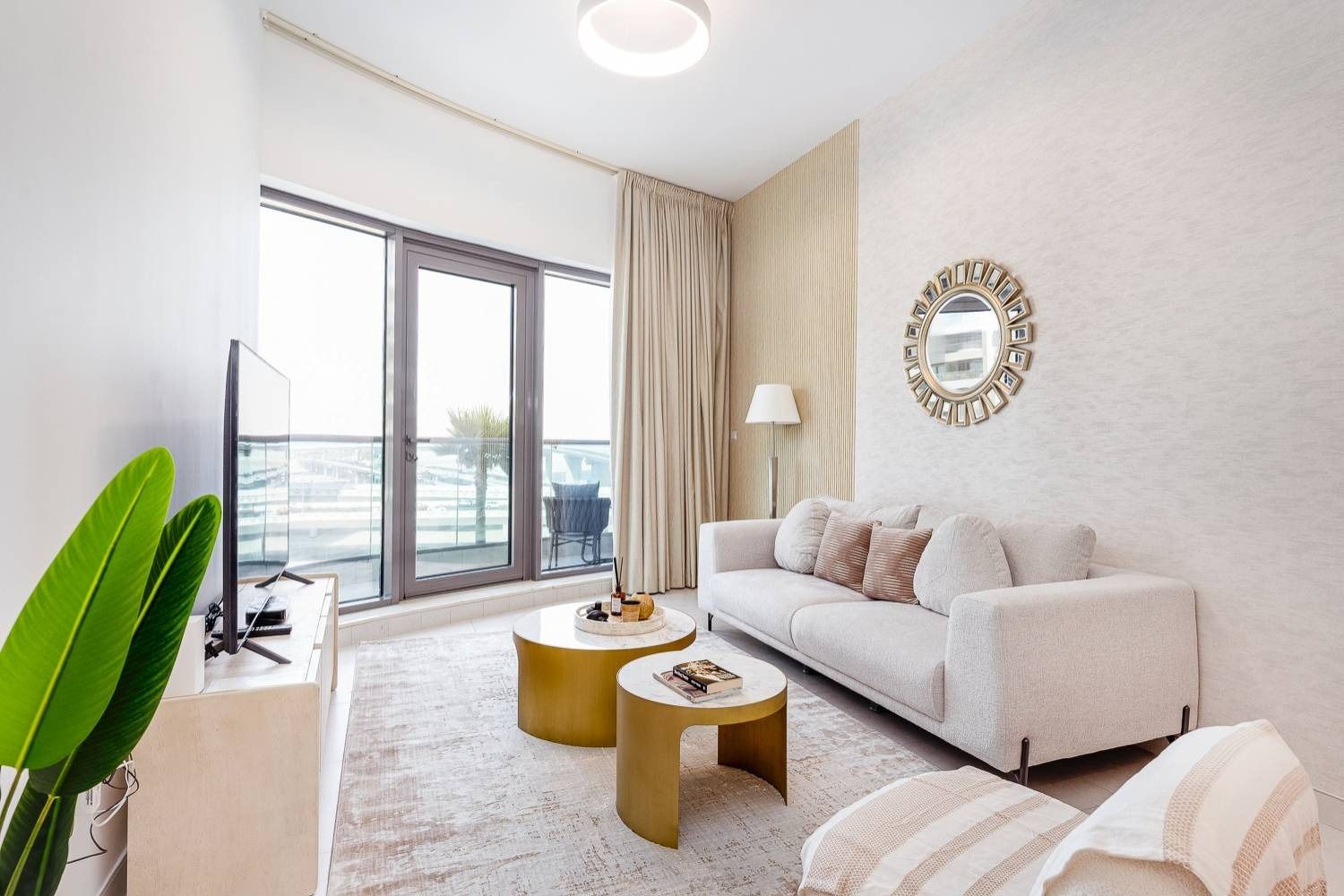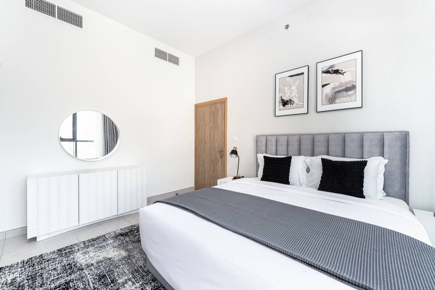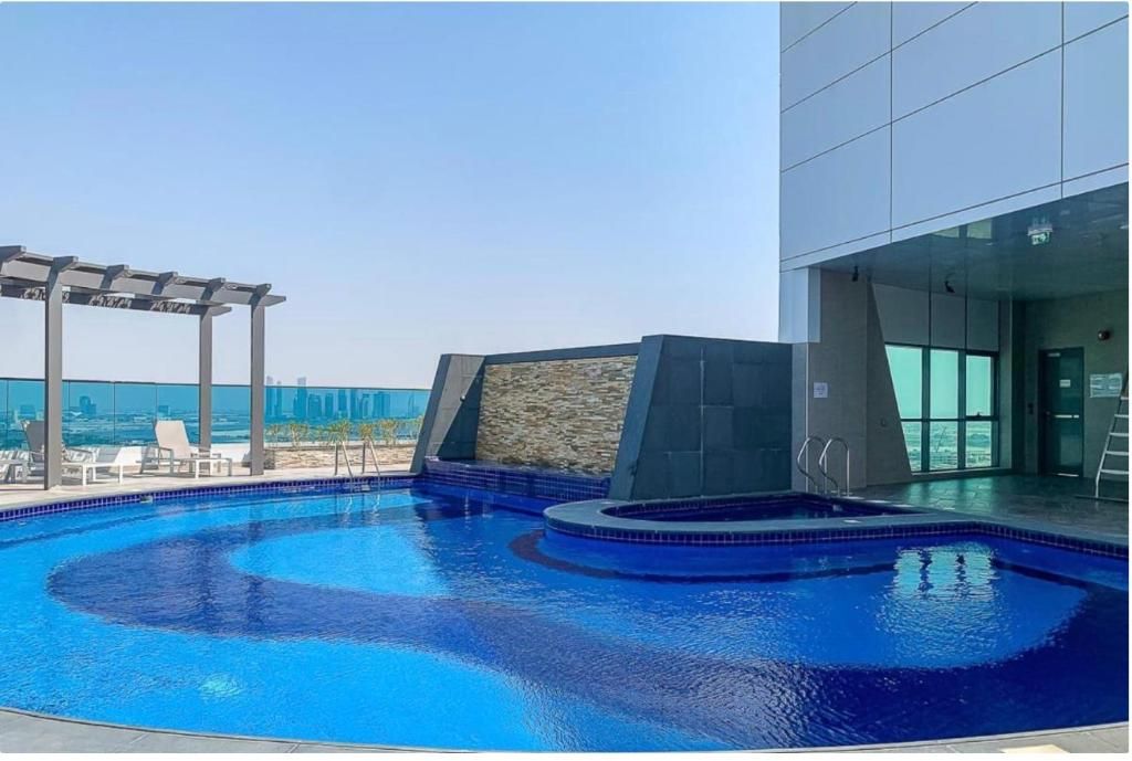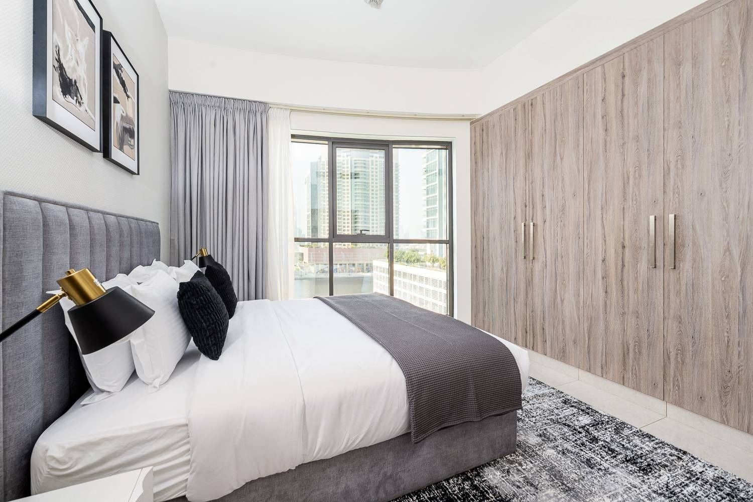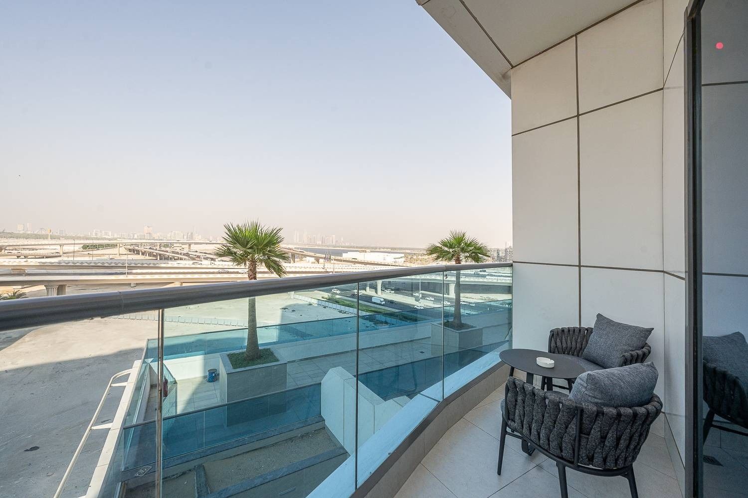 Welcome to my 1 bedroom home in Business Bay, Dubai. Elegant living with an off-white couch, art, and a fully equipped kitchen. The bedroom offers a cozy grey queen bed, canal views, and an outdoor seating area for city vistas. Enjoy the common pool and gym. Your perfect Dubai home awaits!